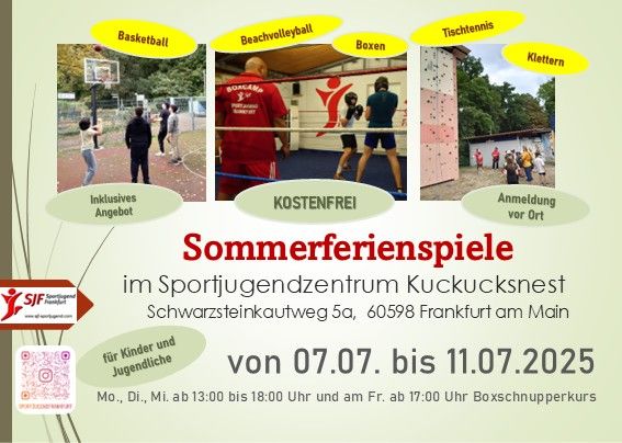 Sommer Camp Zeilsheim von 28. Juli bis 01. August 2025 von Montag bis Freitag, ab 11:00 bis 17:00 Uhr. Seit mehren Jahren veranstaltet die Sportjugend Frankfurt die Ferienspiele im Sport- …