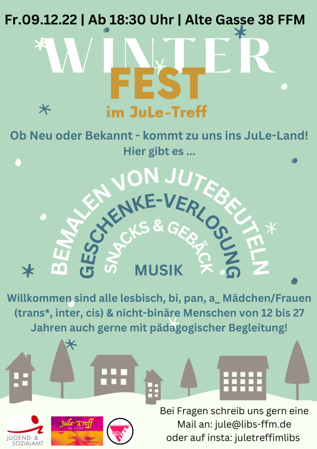 Ein tolles JuLe-Jahr liegt hinter uns. Wir möchten das Jahr mit euch gemeinsam bei Punsch und Snacks ausklingen lassen. Also kommt vorbei!