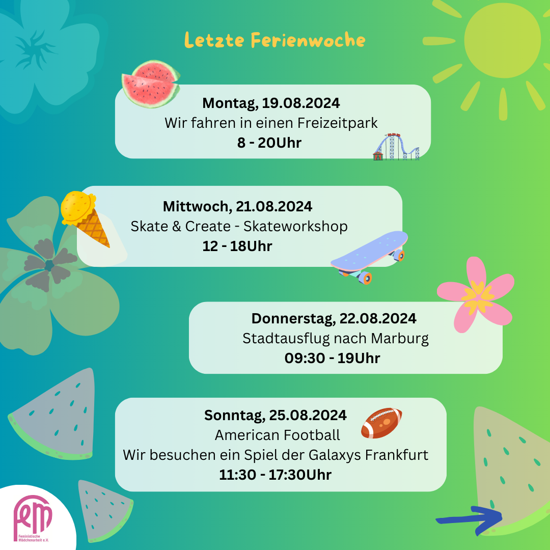 Hier kommt unser tolles Ferienprogramm für die erste und letzte Sommerferienwoche - für alle Mädchen* ab 10 Jahren, die Lust haben auf Ausflüge, Spiel, Spaß und Sommer!