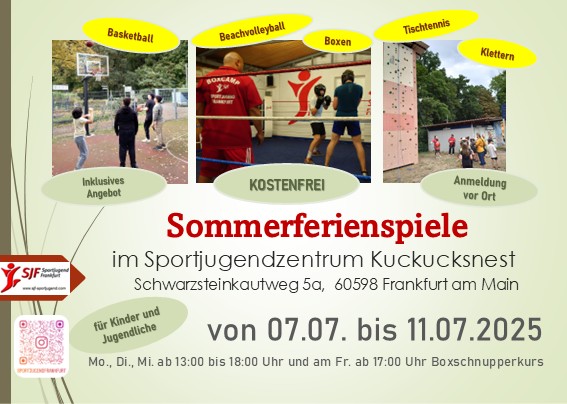 Sommerspiele in der ersten Ferienwoche (7.7. bis 11.7) im Sportjugendzentrum Kuckucksnest in Sachsenhausen: Von Montag bis Mittwoch gibt es Spiel und Sportangebote von 13:00 bis 18:00 Uhr auf unserem Außengelände. Bei Slackline, Kletterturm, Fußball, Basketball und anderen Outdoorspielen ist für alle zwischen 12 und 18 Jahren etwas dabei. Am Freitag (11.07) gibt es dann einen Box-Schnupperkurs mit unserem Boxtrainer Chris. Die Teilnahme ist kostenfrei, Anmeldung erfolgt vor Ort.
