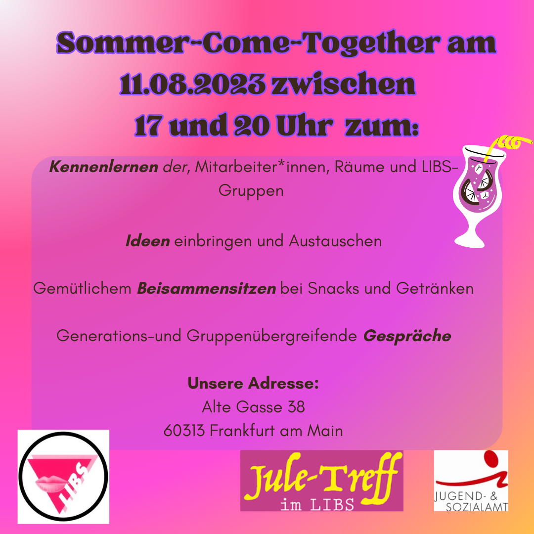 Am 11.8.23 seid ihr herzlich eingeladen zu einem Sommer-Come-Together! Wir möchten einerseits Interessierten die Möglichkeit geben, uns kennenzulernen und andererseits ein gemütliches Zusammensein mit Snacks, Kaltgetränken und Musik, aller LIBS-Gruppen ermöglichen. Wir freuen uns auf eure Ideen, Anregungen und gute Gespräche. Es soll von 17:00 Uhr bis 20:00 Uhr bei uns im Hof und im JuLe Treff unten stattfinden. Alle können gerne etwas zum Snacken mitbringen, sodass wir ein schönes vielseitiges Buffet zusammen bekommen. Das LIBS stellt Kaltgetränke und ebenfalls ein paar Snacks. Wir haben Lust auf Austausch zwischen verschiedenen Altersgruppen, neuen und alten Gesichtern. Lasst uns das LIBS e.V. feiern und eine schöne Zeit zusammen haben. Wir freuen uns auf Euch!