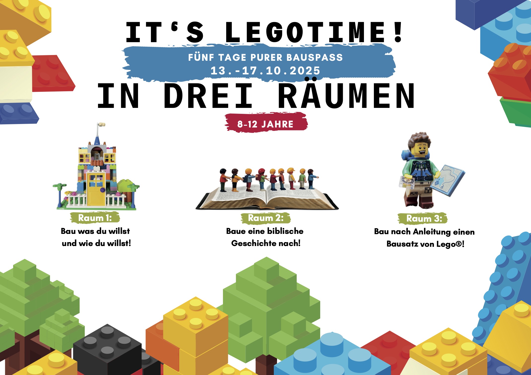 Lass deiner Fantasie freien Lauf! Bau die spannendsten Bauwerke und werde zum Legomeister! Eine Woche lang kannst du in drei verschiedenen Räumen entweder