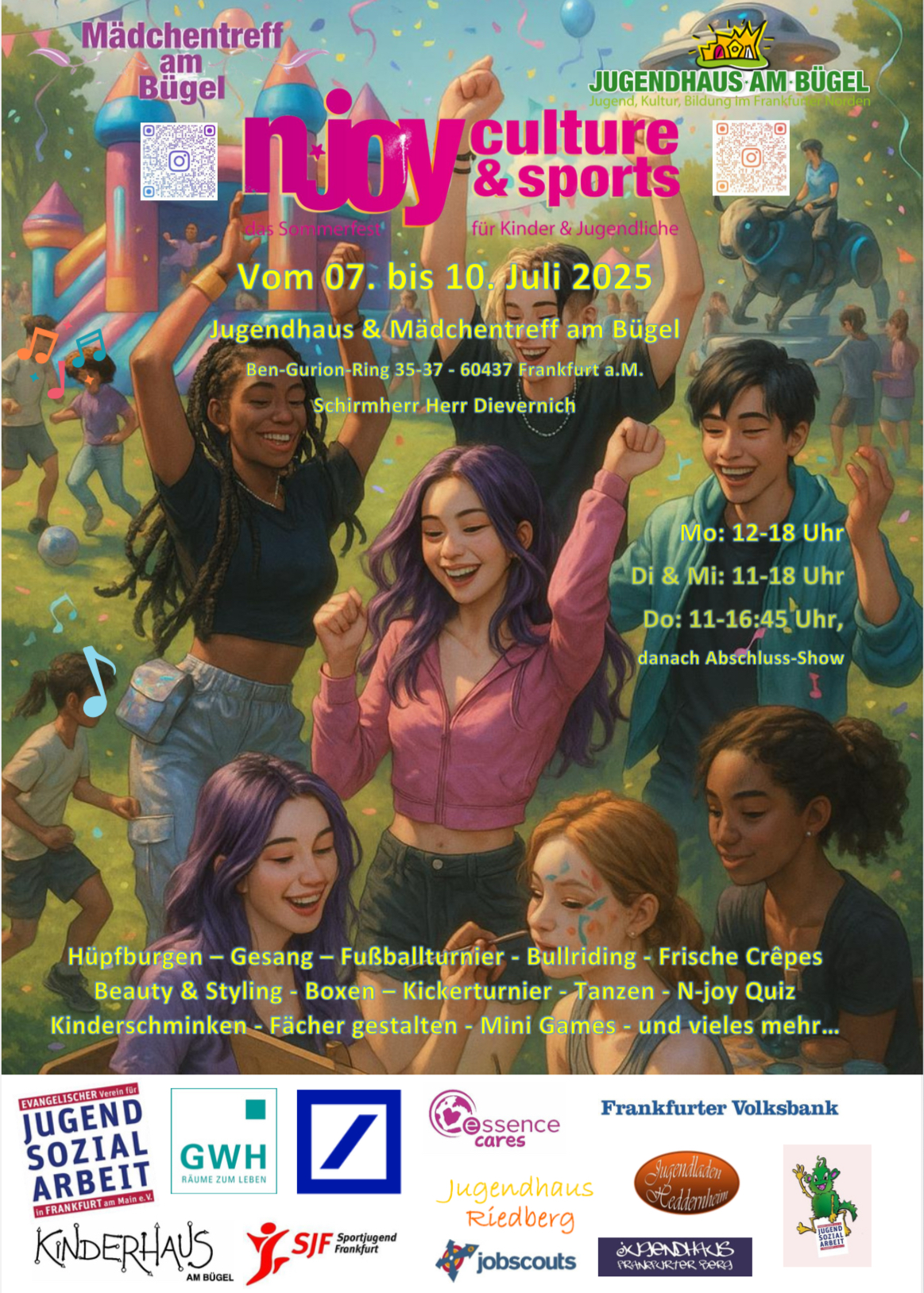 Zum Start in die Sommerferien verwandelt sich das Gelände rund um das Jugendhaus in eine bunte Erlebniswelt für Kinder und Jugendliche: Vom 07. bis 10. Juli findet erneut das beliebte „N-Joy: culture & sports“-Festival statt – organisiert vom Jugendhaus und Mädchentreff am Bügel in Kooperation mit der Sportjugend Frankfurt und unterstützt von zahlreichen sozialen Einrichtungen aus dem Frankfurter Norden.