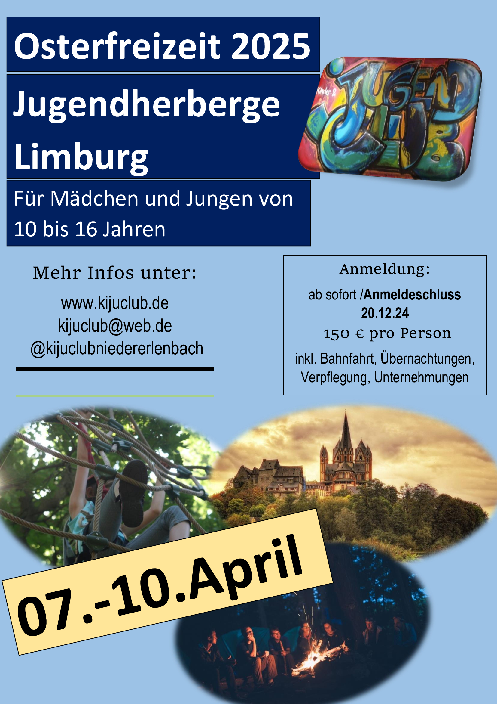 Vom 07.April bis 10.April findet unsere Osterfreizeit statt. Diesmal geht es nach Limburg.