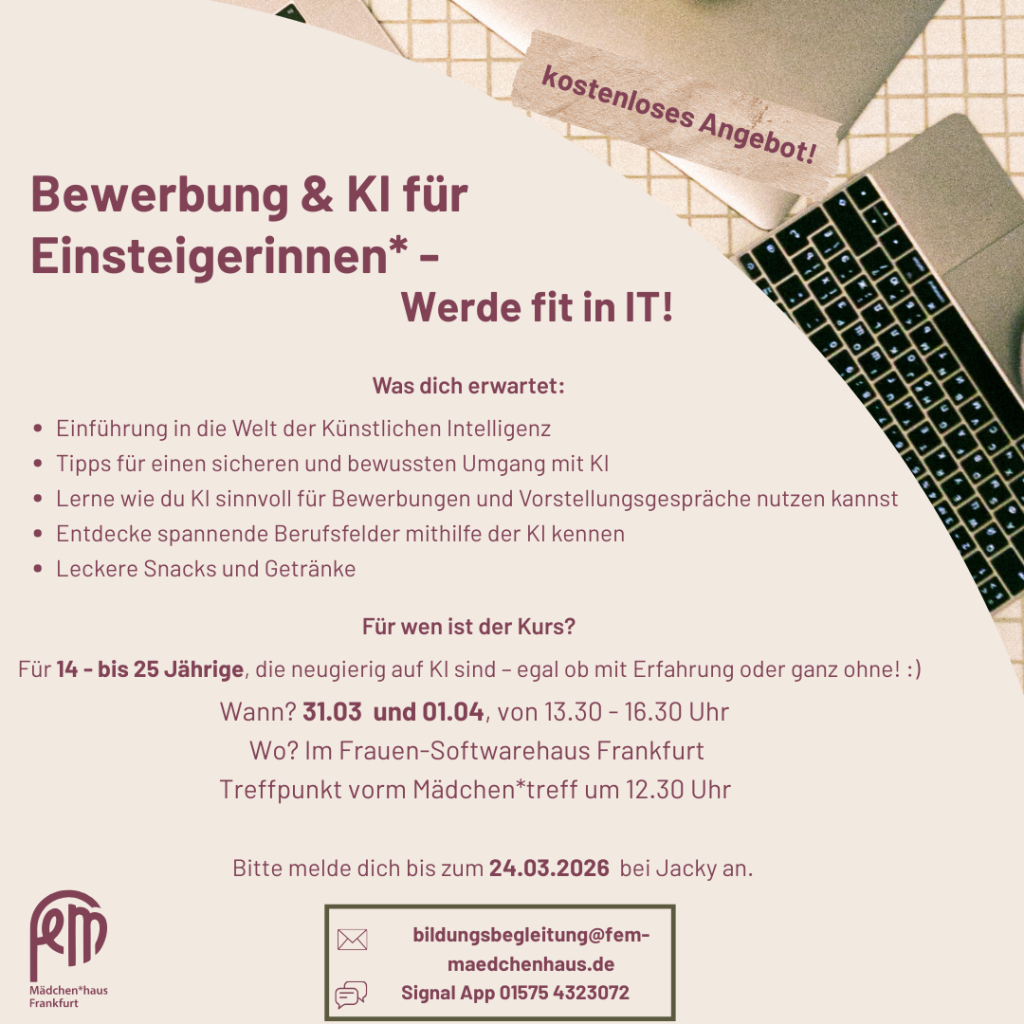 In den Osternferien haben junge Frauen* zwischen 14 – 25 Jahren die Möglichkeit, die spannende Welt der Künstlichen Intelligenz (KI) kennenzulernen. Im zweitätigen Kurs beschäftigen wir uns …